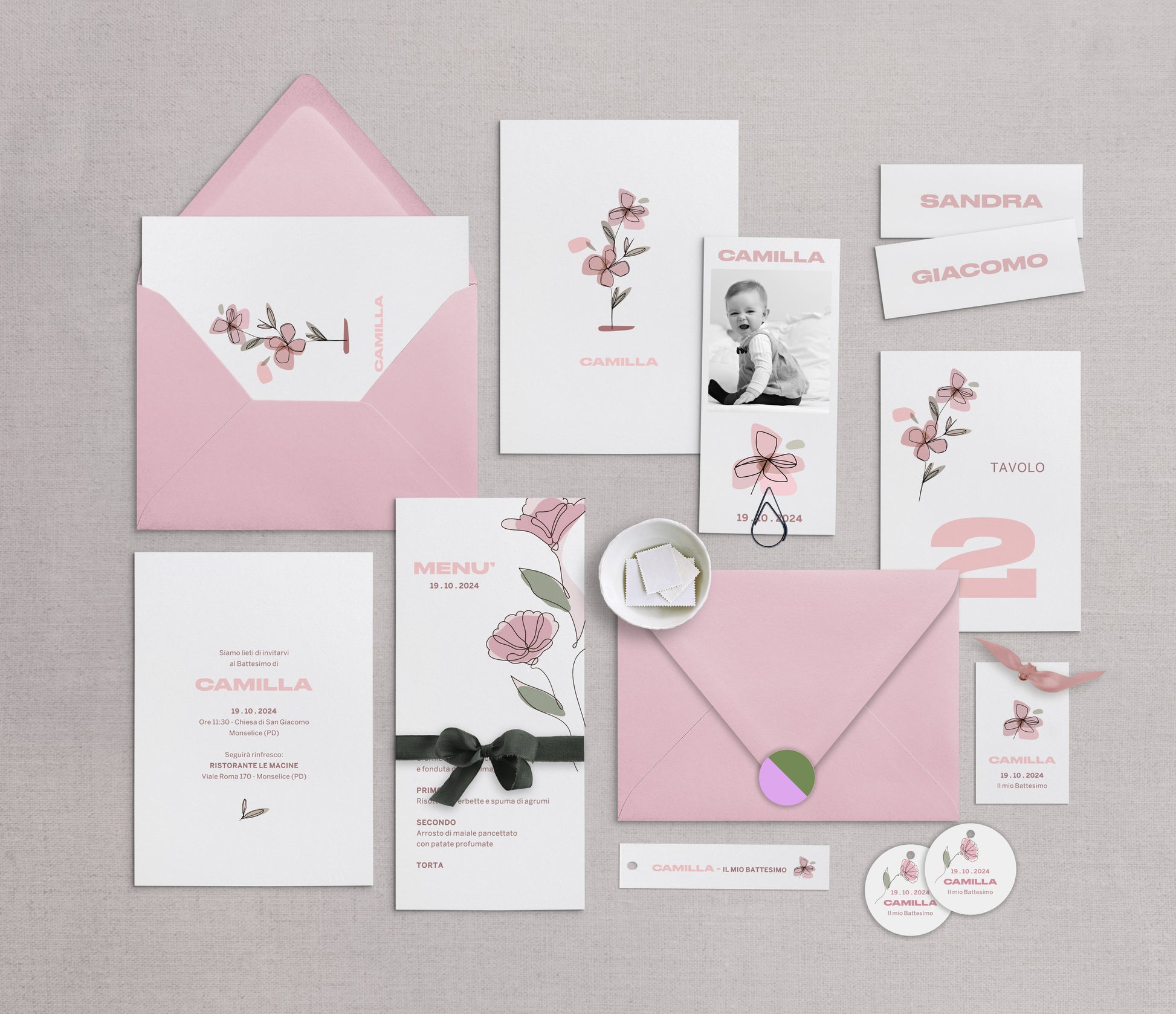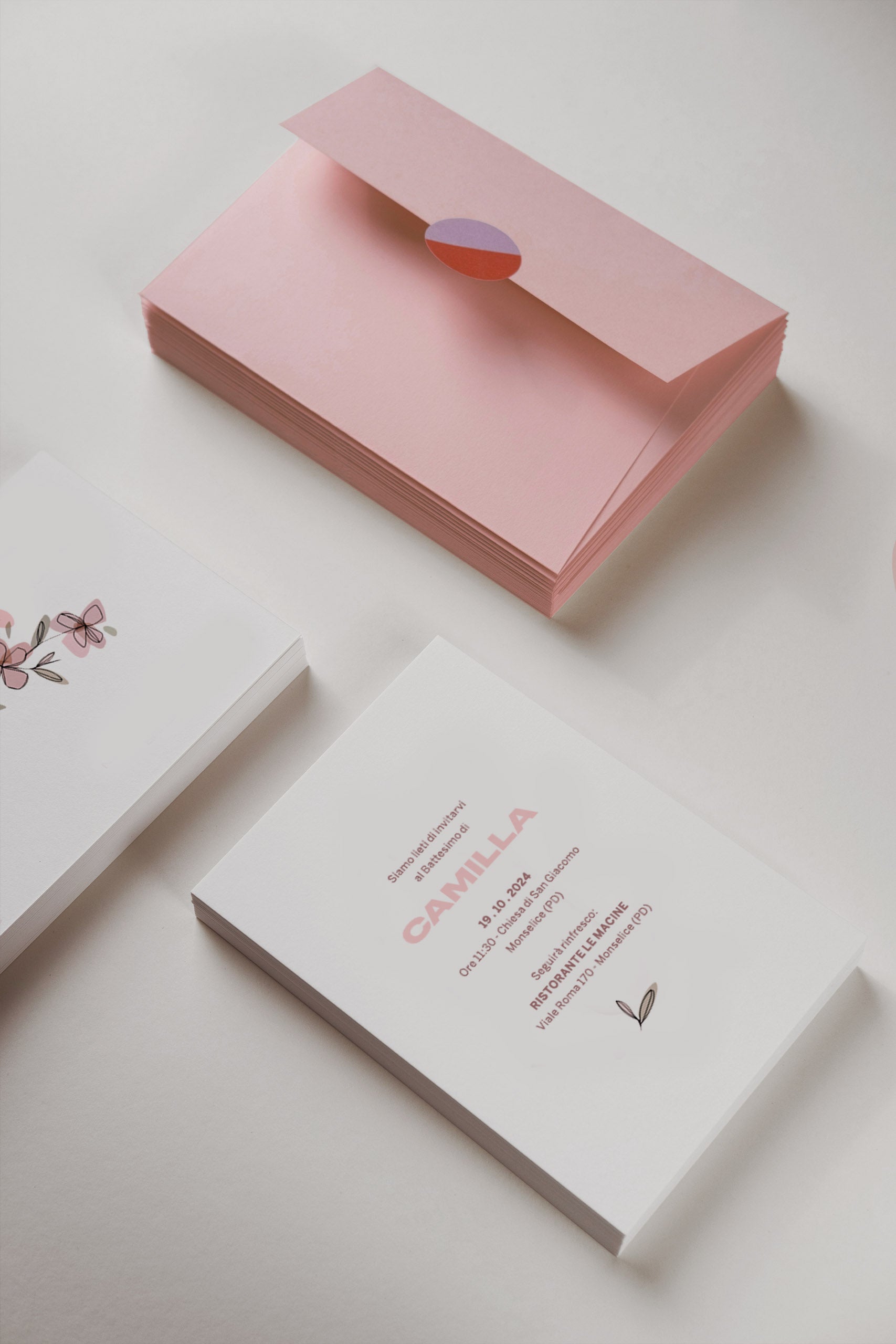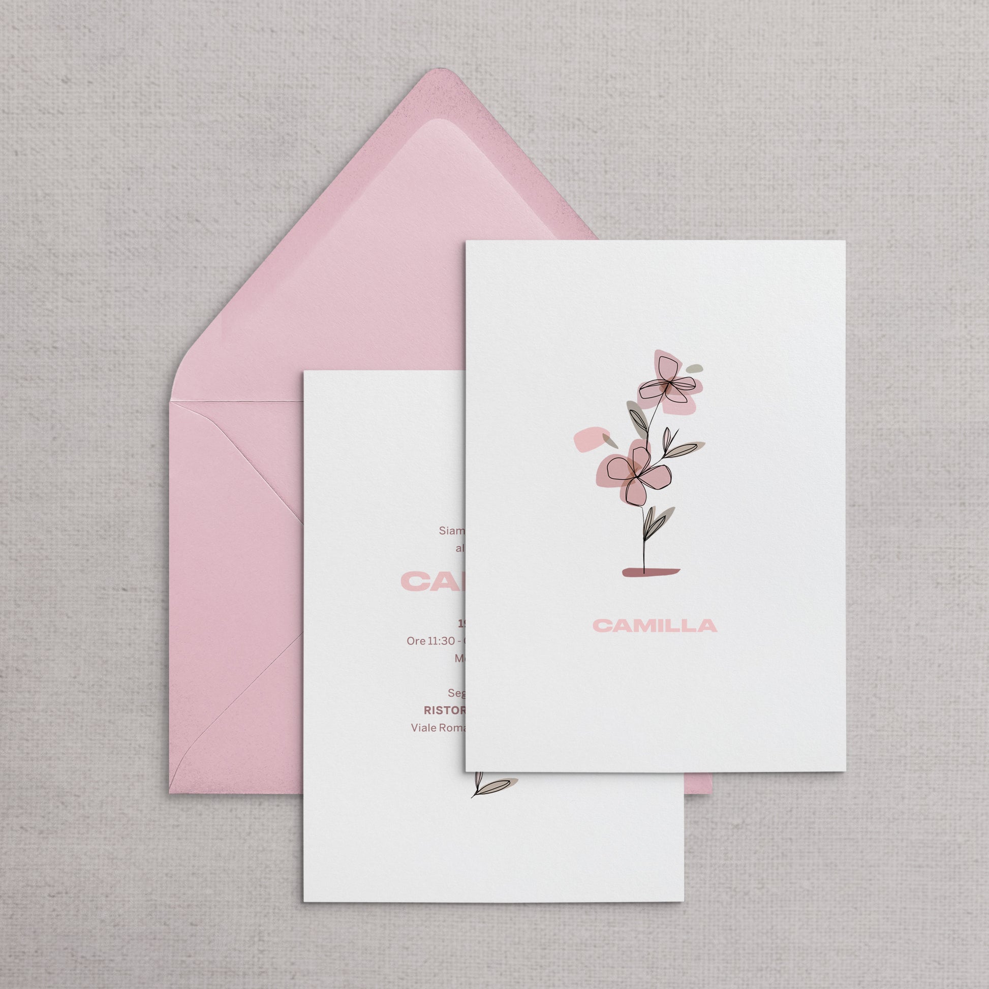 L'illustrazione e l'impostazione grafica del set "CAMILLA" non sono personalizzabili. Sarà possibile modificare solamente le informazioni personali presenti sul biglietto d'invito.